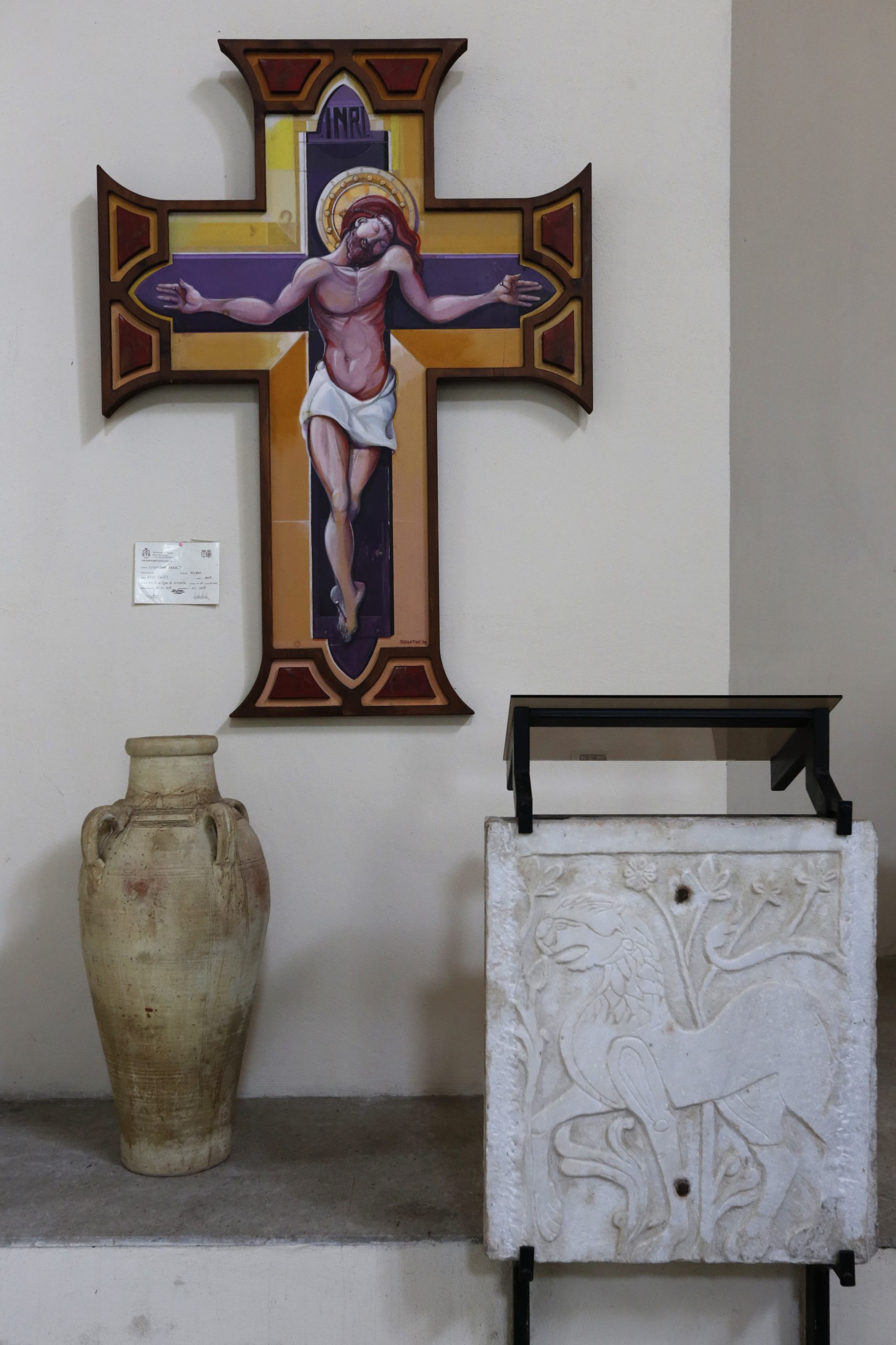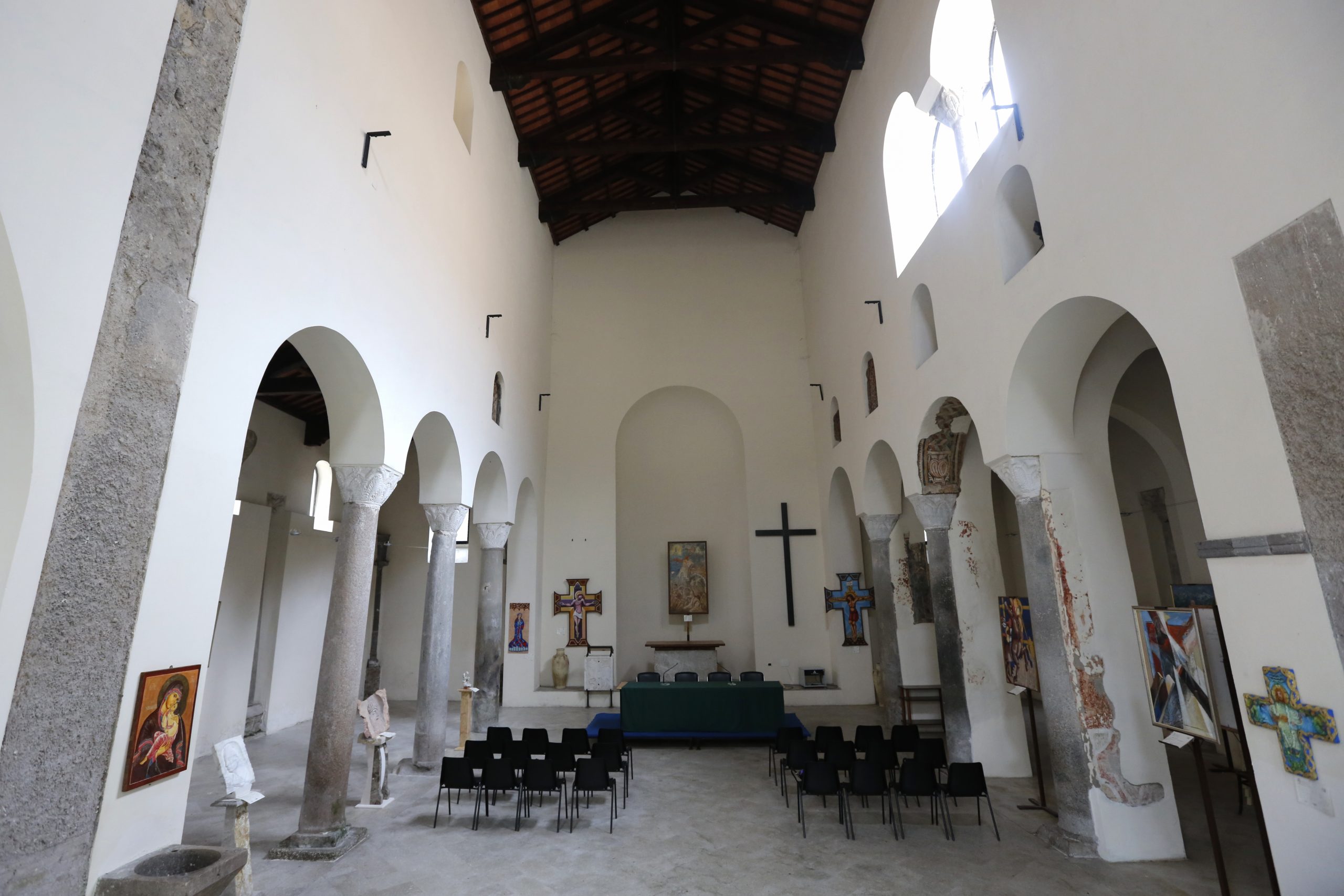 Il complesso monumentale è di altissimo livello con elegante soffitto a capriate in legno oscuro. Strettamente connesso alla chiesa il campanile romanico in pietra e tufo (XII sec.) presenta due ordini di bifore.