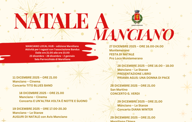 Il Palio delle Botti, a fine agosto, con un’appassionante sfida tra i 6 rioni cittadini. La Festa delle cantine (secondo weekend di settembre) con cantine aperte, piatti e prodotti tipici, mercatini, musica e spettacoli itineranti. Manciano Street Music Festival (luglio) primo festival in Italia interamente dedicato alle street band, dove si esibiscono anche nomi di alto livello. Saturnia Film Festival (luglio) dedicato ai migliori cortometraggi provenienti da tutto il mondo, trasforma trasformando le piazze dei borghi in “cinema sotto le stelle”. Saturnia Festival (fine agosto-inizio settembre) con concerti di musica che spaziano dal jazz al classico.