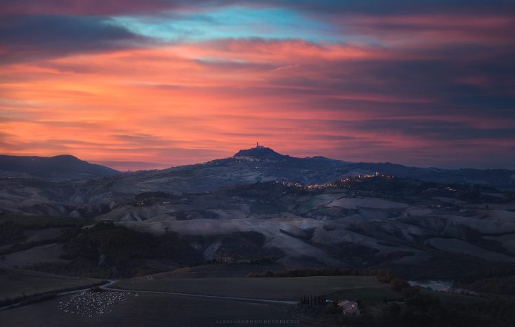 A metà strada tra Firenze e Roma, tra la Tuscia Viterbese e la Terra di Santa Caterina, uno dei cinque Comuni della Val d’Orcia, Patrimonio dell’Umanità dal 2004. Si erge una rupe rocciosa che sfiora il cielo. Il luogo è stato scelto dall’uomo da tempo immemorabile, come controllo e difesa di un vastissimo territorio. La rupe domina le valli dell’Orcia e del Paglia, attraversate dalla Via Francigena, che proprio in Radicofani trovava un luogo fortificato e sicuro, e dalle Vie Traverse tra l’Umbria e la Maremma. Radicofani era formato da quattro borghi, uno dei quali “Viclanus”, aveva origini etrusco-romane. I longobardi strutturano il territorio, infatti il toponimo Radicofani deriva dal nome del re longobardo : Rachis, “Rachis hofen” = “Corte di Rachis”. Ricordato già nel 973 già “cum suo castro”…con le sue fortificazioni. La sua storia è legata indissolubilmente alla Via Francigena, forse lo ”Sce Petir in Pail” di Sigerico, ma non ne abbiamo certezza, altri personaggi antichi lo ricordano come Nikulas di Munkathevera nel 1154, Filippo Augusto re di Francia nel 1191, l’abate Emo nel 1212, l’arcivescovo Eudes Rigaud nel 1254…. Conteso dai signorotti locali, fu acquistato dal papa Eugenio III nel 1153. Nel 1154 papa Adriano IV° vi costruisce un vero e proprio castello. Alla fine del 1200 è l’ avamposto del famoso bandito-gentiluomo Ghino di Tacco ricordato da Dante e Boccaccio. Preso in affitto dalla Repubblica di Siena nel 1411 passò ai Medici nel 1559. Nel 1255 vi erano attestati ben sei Spedali per i Pellegrini : Xenodochio di Muliermala, Spedale di Fonte Ceccola dei monaci Camaldolesi, Spedale di Spineto dei monaci Vallombrosani, Spedale di S. Maria dei monaci Cistercensi, Spedale di Bonaionte, e la “Domus Leprosorum”.