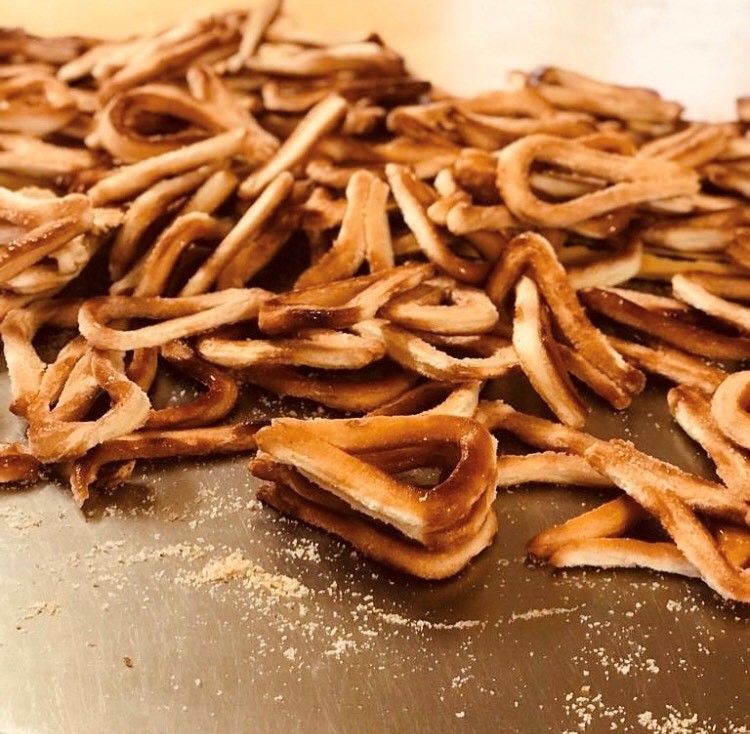 I protagonisti della sagra, i torcetti, sono biscotti friabili fatti con semplici ingredienti: farina, burro e zucchero, piccoli grissini rotolati nello zucchero che si piegano e si uniscono le due estremità per dare loro la tipica forma a goccia.
