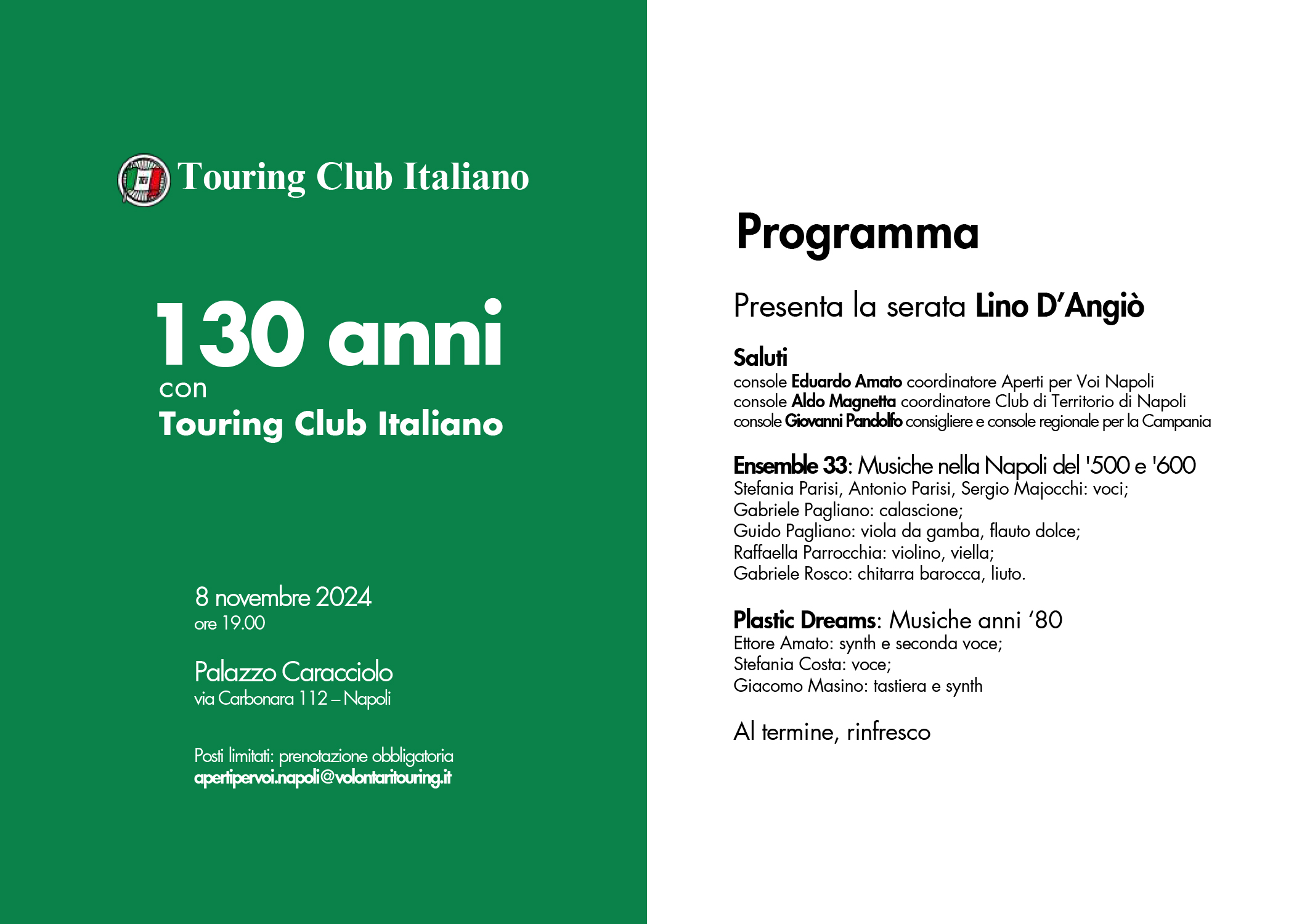 La manifestazione, di valenza regionale per la Campania, è stata organizzata dai colleghi di ApV e del CdT di Napoli, in particolare dal console Eduardo Amato, coordinatore di ApV Napoli. La grafica è stata curata dal vice console regionale Marianna D’Orsi Pisani. Ringraziamo entrambi. In allegato locandina e programma della serata.