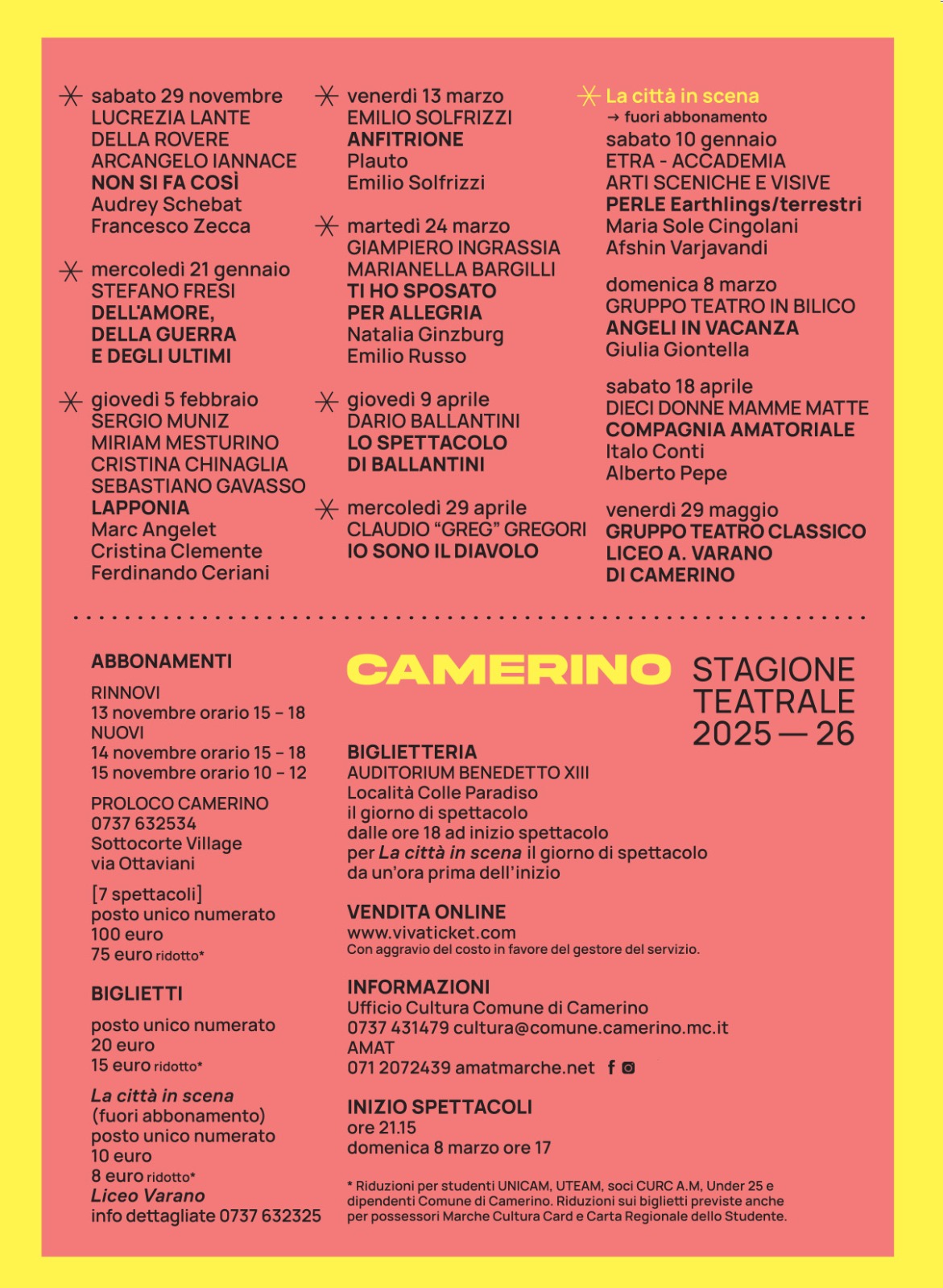 La città in scena – in vendita da fine novembre alla biglietteria dell’Auditorium Località Colle Paradiso aperta il giorno dello spettacolo dalle ore 18, nelle biglietterie AMAT/VivaTicket e su vivaticket.com (con aggravio in favore del gestore del servizio).
