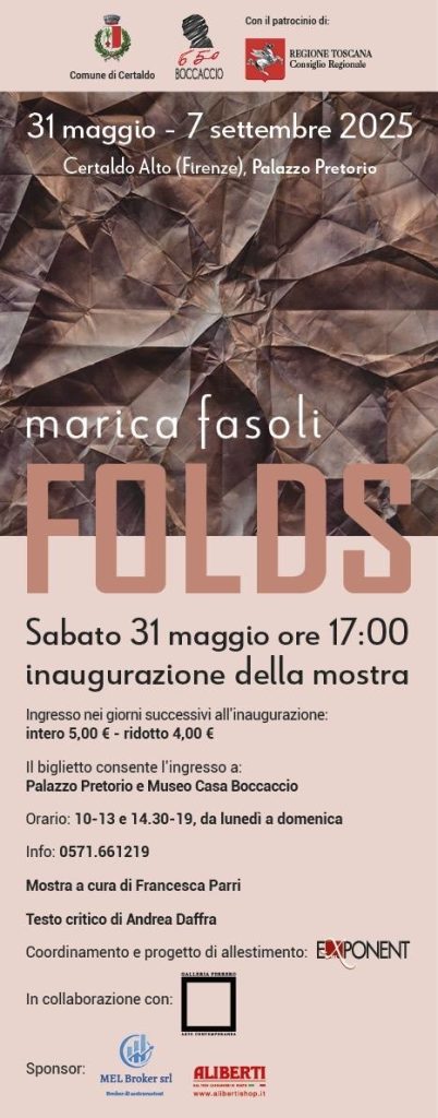 La mostra “Folds” dell’artista Marica Fasoli, , fa parte della rassegna #CertaldoArte25. L’ esposizione è parte del programma di celebrazioni del 650° anniversario della morte di Giovanni Boccaccio, organizzate a Certaldo, borgo Bandiera Arancione del Touring Club Italiano.