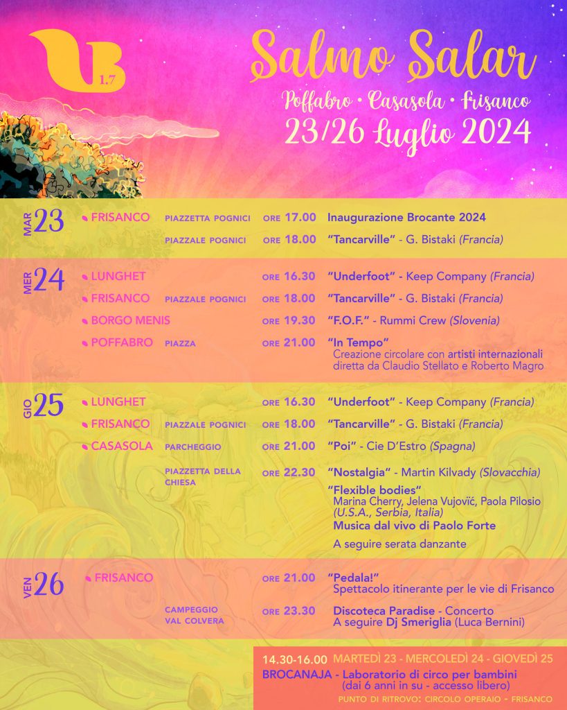 Dal 23 al 26 luglio, il circo magico di Brocante animerà le piazze, le vie e la vallata con i suoi colori e con spettacoli circensi nello splendido scenario del borgo instaurando un legame con le persone e con la natura circostante.