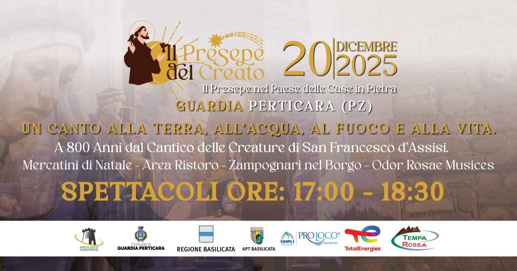 Nel suggestivo scenario di Guardia Perticara, Bandiera Arancione del Touring Club Italiano, l’intero borgo si trasformerà in un percorso narrativo e scenico che accompagnerà il pubblico attraverso i quattro elementi celebrati dal Santo: Terra, Acqua, Fuoco e Vita.