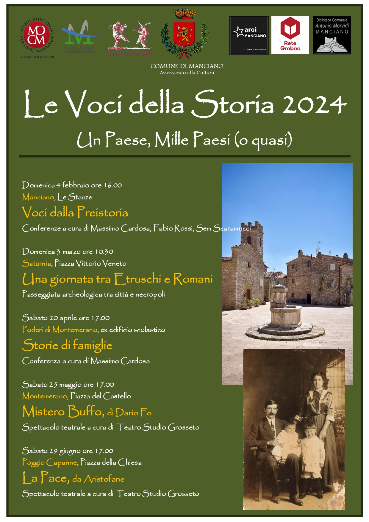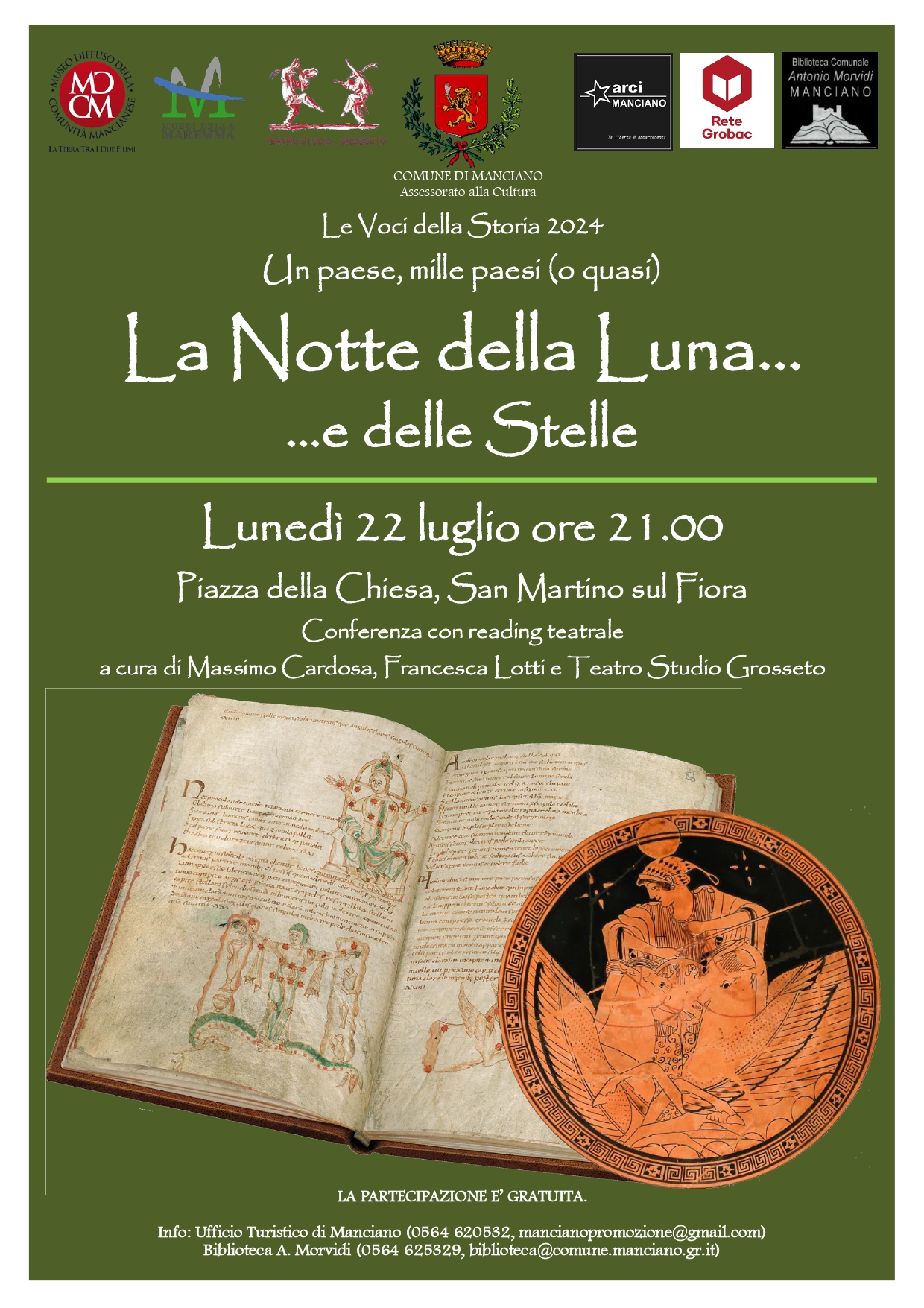 Lunedì 22 luglio, serata all'interno dell'iniziativa "Le Voci della Storia 2024. un paese, mile paesi (o quasi)" rassegna di arte, storia e archeologia organizzata dai Musei Civici di Manciano con la Biblioteca Morvidi, in collaborazione con Teatro Studio Grosseto e il supporto del Circolo Arci di Manciano.