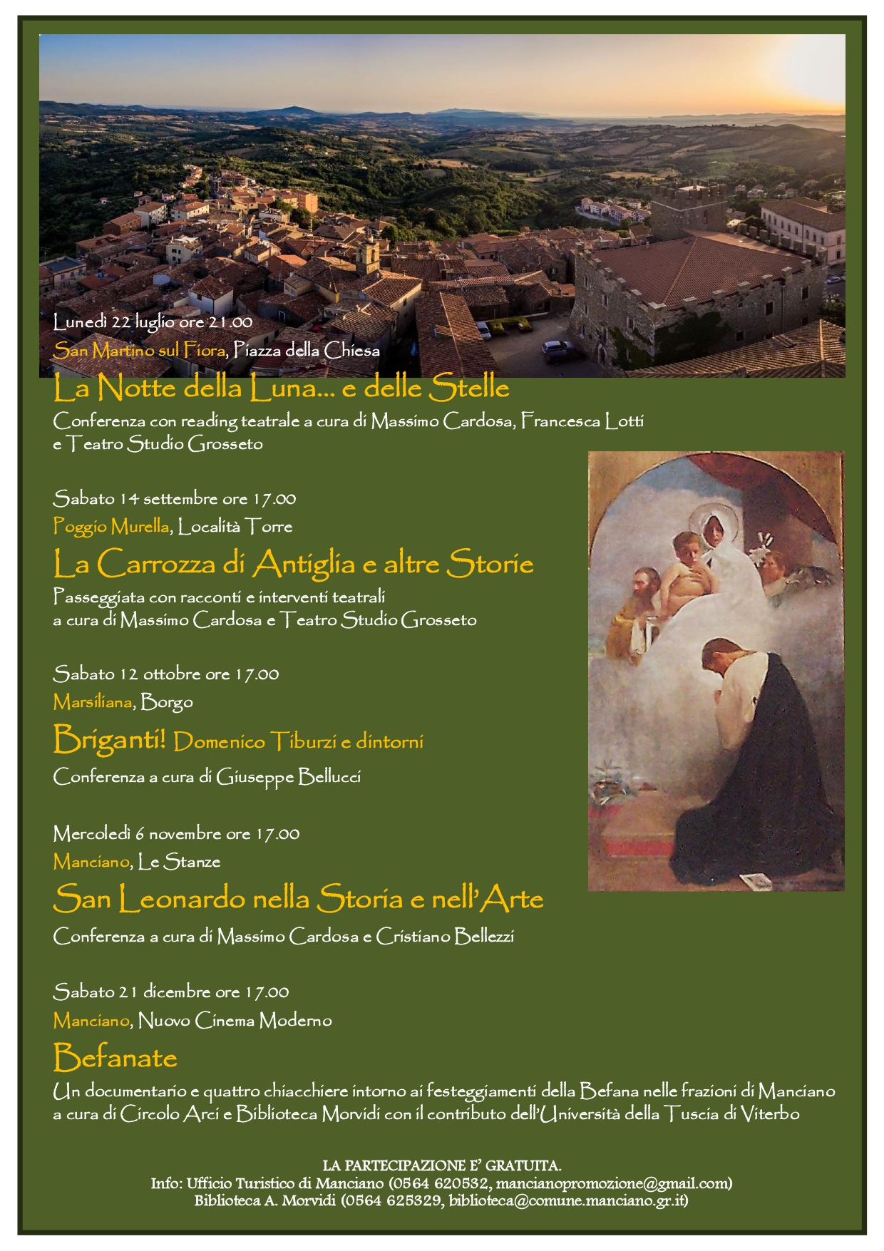 Lunedì 22 conferenza con reading teatrale a cura di Massimo Cardosa (Direttore dei Musei Civici di Manciano), Francesca Lotti e Teatro Studio Grosseto. La serata sarà a San Martino sul Fiora, frazione del Comune di Manciano.