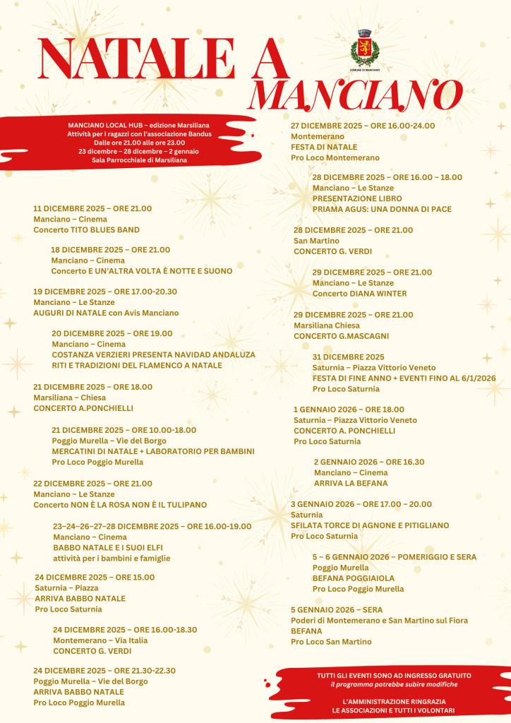 Dall’11 dicembre 2025 al 6 gennaio 2026, un calendario ricchissimo di eventi per grandi e piccoli, tra musica, tradizioni, mercatini e magia natalizia a Manciano, Bandiera Arancione del Touring Club Italiano.
