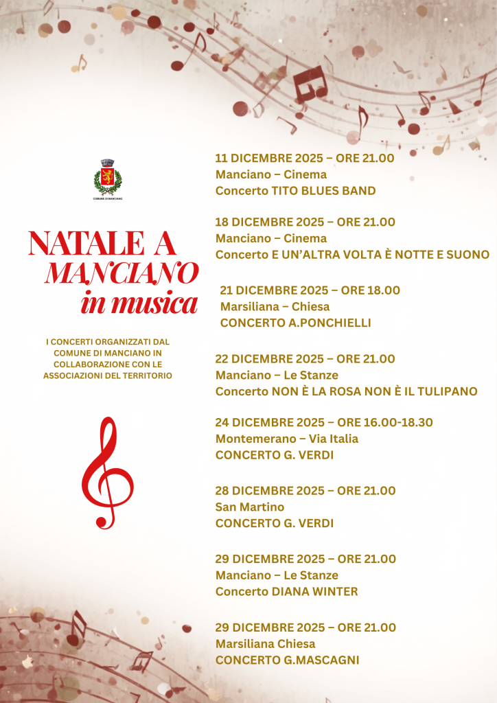 Dall’11 al 29 dicembre 2025, Manciano, Marsiliana, Montemerano e San Martino si animeranno con appuntamenti che spaziano dal blues alla musica d’autore, dalla tradizione classica alle sonorità contemporanee, creando atmosfere suggestive e momenti di condivisione per tutta la comunità.