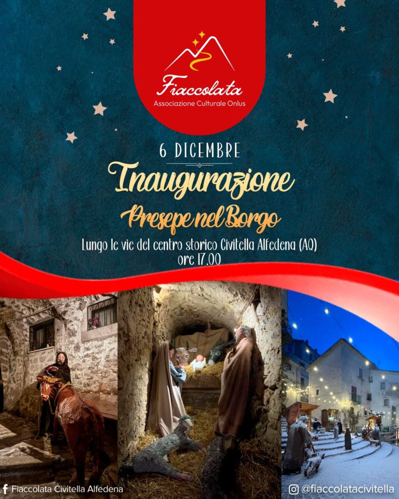 Dal 6 dicembre al 6 gennaio, da non perdere “Presepe al borgo”: negli angoli più suggestivi della località vengono ricostruite scene di vita quotidiana, tra antichi mestieri e tradizioni tipiche, in un percorso che porta alla grotta della Natività, tra suoni e rumori, anche dialoghi in dialetto per rendere le scene più reali.