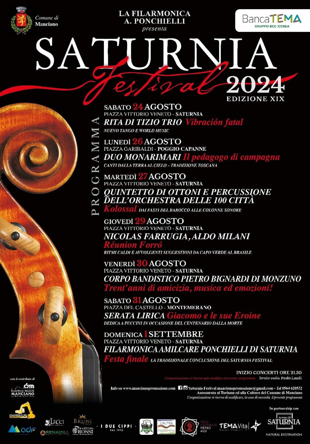 1° settembre: Festa Finale - La tradizionale chiusura del Saturnia Festival con la Filarmonica Amilcare Ponchielli (piazza Vittorio Veneto, Saturnia)