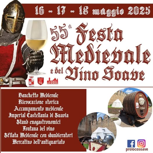 Dal 16 al 18 maggio, tra le mura di cinta del centro storico, sotto l’occhio vigile del maestoso Castello che domina la collina, nelle piazze e lungo le diverse vie del centro di Soave, potrete fare un tuffo nel passato nell’epoca più affascinante della storia soavese; il Medioevo, per festeggiare e godere del Vino Bianco d’Italia per eccellenza, frutto di queste magnifiche terre fertili e del sapiente lavoro dell’uomo.