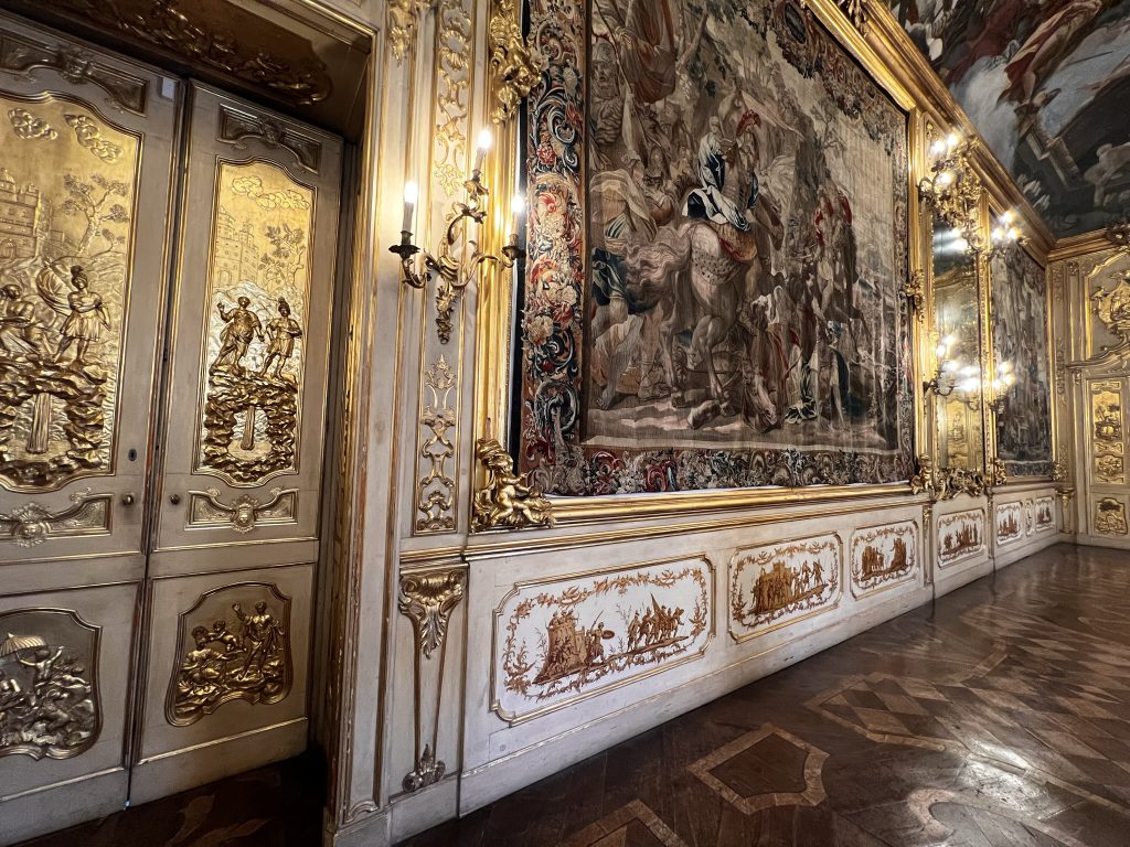 Immagina la calda luce del tramonto che illumina le maestose figure statuarie della boiserie, creando un'atmosfera magica e suggestiva. Ammira il carro del sole, protagonista della straordinaria volta della Galleria di Palazzo Clerici, che sembra trasformarsi con l'arrivo delle stelle, regalandoti uno spettacolo visivo unico.