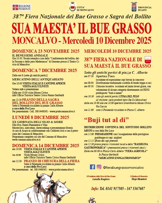 A Moncalvo, mercoledì 10 dicembre, si celebra la Fiera del Bue Grasso, una fiera antichissima e strettamente legata alla tradizione contadina del Monferrato tutta all'insegna della pregiatissima razza bovina piemontese; il Fassone.