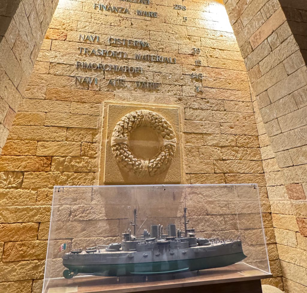 Eppure, vuoi per il racconto del sig. Angelo che ci ha accolti come un grand’uomo di altri tempi, vuoi per la presenza della sig.ra Maria portavoce di cultura e gentilezza senza limiti, per qualche ora ci è parso di essere stati trasportati in tempi che non abbiamo vissuto, ma in cui altri si sono sacrificati per tutti noi a costo della loro vita. Certo, un luogo realizzato in memoria dei caduti non poteva fare a meno di alcune significative testimonianze: le lapidi marmoree con i nomi dei marinai caduti, la statua dedicata alla Vergine Stella al Mare, la campana di bordo della corazzata Brin ci hanno indotto riflessioni e considerazioni ai limiti di un particolare imbarazzo, poiché ci rendiamo conto che purtroppo la società dimentica in fretta - e chissà se oggi ci meritiamo i comportamenti eroici di altri.