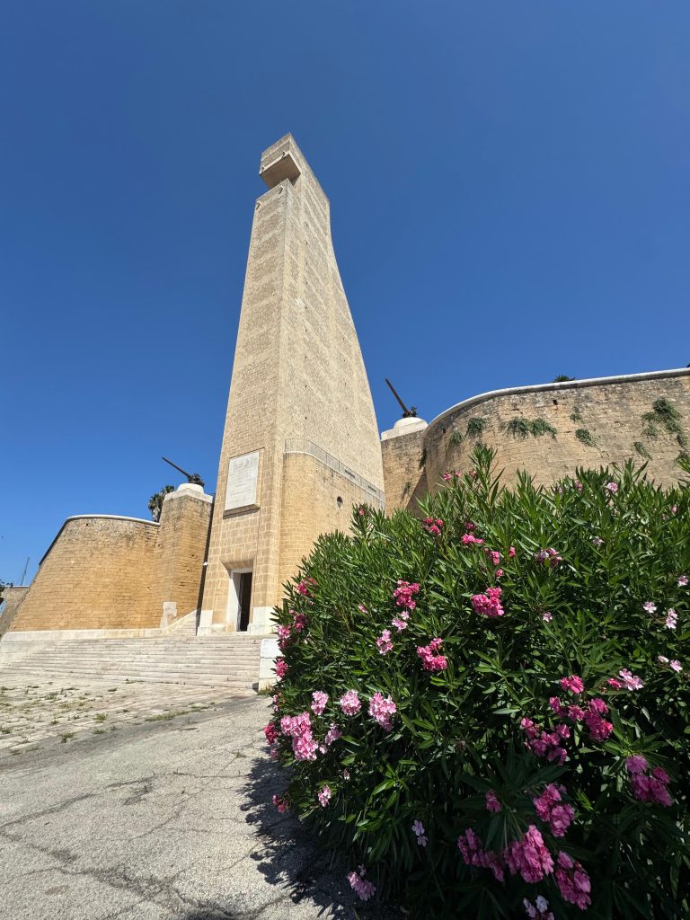 Il monumento, inaugurato nel 1933, nasce con lo scopo di celebrare i circa 6000 marinai italiani morti durante la Prima Guerra Mondiale; si trova al centro del porto, imponente e silenzioso, come un custode vigile del mare e del tempo. Cinquantatré metri di pietra calcarenite denominata carparo e cemento armato, a forma di timone, che puntano verso il cielo e verso l’Adriatico, come se volessero indicare la rotta giusta da seguire.