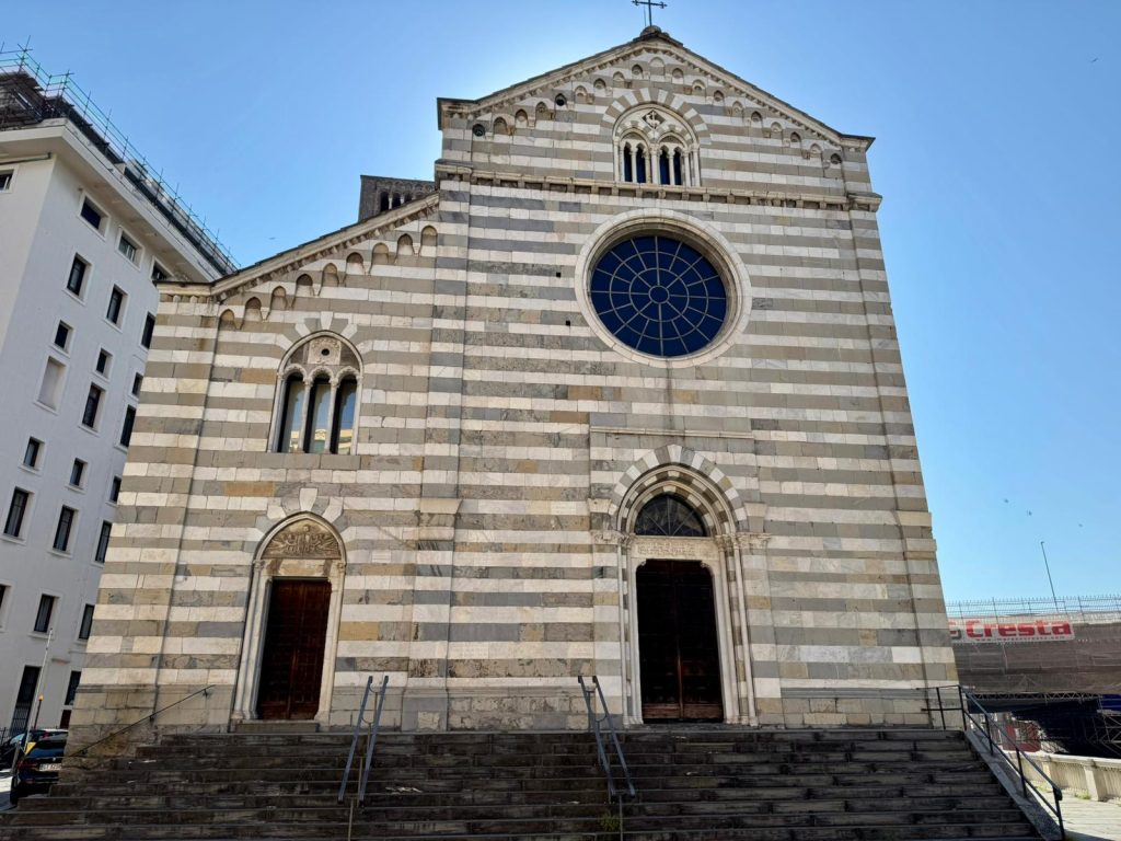 Fondata attorno al X secolo dall’allora vescovo di Genova, Teodolfo, l’abbazia rappresenta una delle testimonianze più antiche e meglio conservate della spiritualità cittadina. Il suo impianto attuale, con la facciata romanica a bande bicrome in marmo bianco e pietra scura di Promontorio, è un esempio prezioso di romanico genovese puro, sobrio ma solenne, capace di attraversare i secoli senza perdere la propria identità.