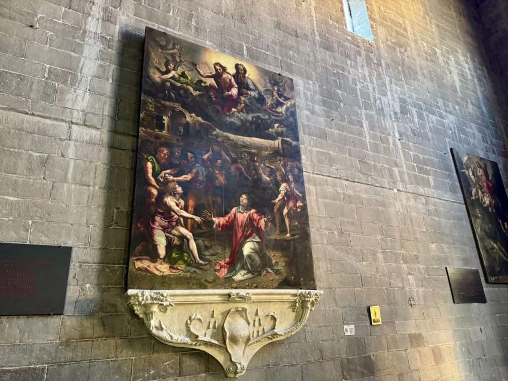 All’interno, l’abbazia custodisce numerose opere d’arte di epoche diverse. Tra le più significative spicca La lapidazione di Santo Stefano, attribuita a Giulio Romano, il più brillante allievo di Raffaello. Il dipinto rappresenta con grande pathos il martirio del santo titolare dell’abbazia: le espressioni tese, i corpi in movimento, la violenza cristallizzata in un istante drammatico, contrastano con il silenzio che pervade la navata, rendendo la scena ancora più intensa.