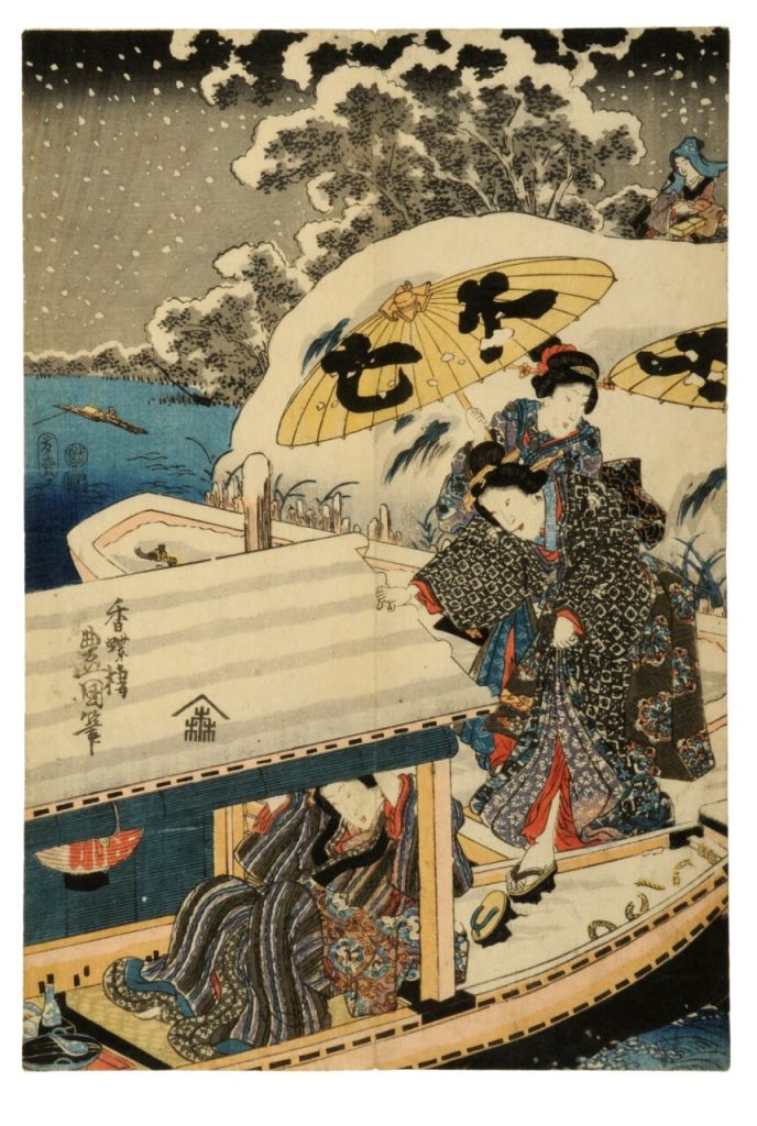 Tra le opere più suggestive, le stampe ukiyo-e di Utagawa Kunisada, Hiroshige e Kuniyoshi, nelle quali la neve si carica di profondi significati simbolici. Nell'arte giapponese il ruolo della neve è profondamente simbolico e rimanda ai concetti di purezza, silenzio e bellezza effimera. Emblematica la xilografia di Kunisada Tre dame in barca in un paesaggio nevoso (periodo Edo, 1847-52), proveniente dal MUCIV di Roma attraverso la rete MIPAM.