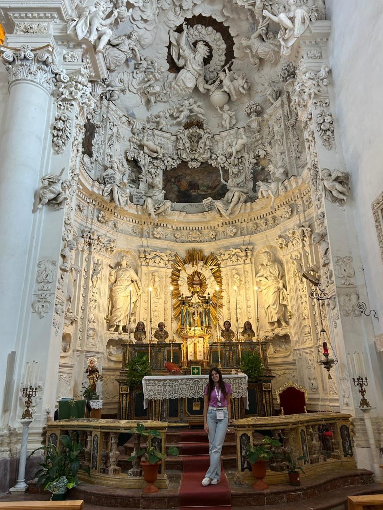La Cappella del Santissimo Sacramento ha offerto un momento di raccoglimento e silenzio. Le decorazioni creano un ambiente intimo, dove la luce sembra accarezzare le superfici. Particolari i quattro busti contenenti le reliquie dei santi. Alessandra ha ammirato con stupore l’eleganza degli stucchi rappresentanti fiori e frutti.
