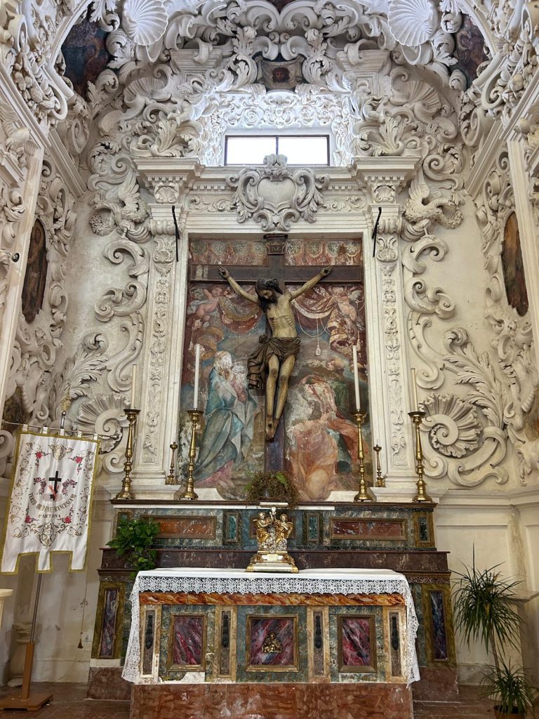 Una delle cappelle che merita menzione è stata sicuramente la Cappella del Santissimo Crocifisso. Il crocifisso ligneo, scolpito con maestria, trasmette un senso di dolore e redenzione. La cappella arricchita da stucchi, che rappresentano festoni di fiori, foglie di acanto e conchiglie ha in particolare stupito Salvatore che ha apprezzato la ricchezza dei dettagli nascosti.