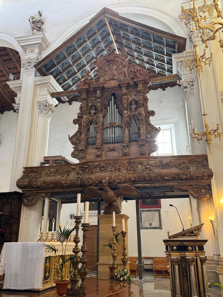 I volontari Touring ci hanno fatto apprezzare un gioiello musicale presente sull’altare: l’organo. Lo strumento risalente al 1600 è arricchito da dettagli azzurri e di color legno, non ha mantenuto il colore oro originale e dopo il restauro, è stato rimontato in una posizione arretrata rispetto all’originale.