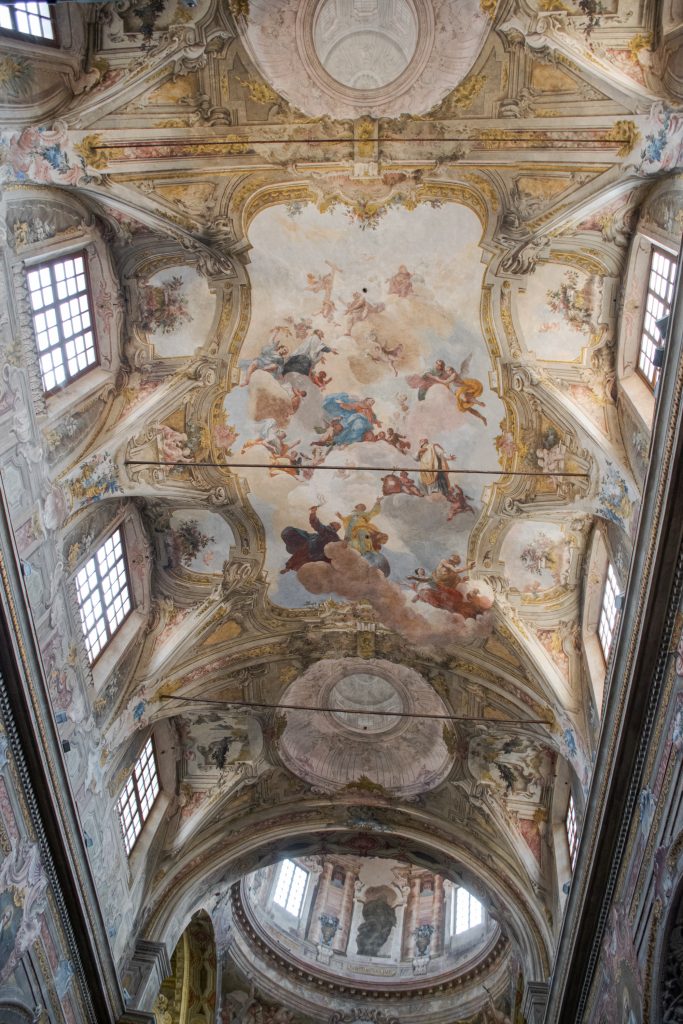 Se la facciata del complesso si presenta in mattoni a vista, ripartita in due ordini architettonici, movimentata da lesene, fregio e un finestrone centrale in asse con un timpano spezzato e il portale di accesso in pietra e granito, l’interno presenta una pianta longitudinale con transetto, cappelle laterali e una cupola con alto tiburio. L’apparato decorativo settecentesco si fregia dei lavori, tra gli altri, di Felice Biella, Andrea e Giovan Battista Galluzzi, Roberto De Longe e Giovanni Evangelista Draghi.