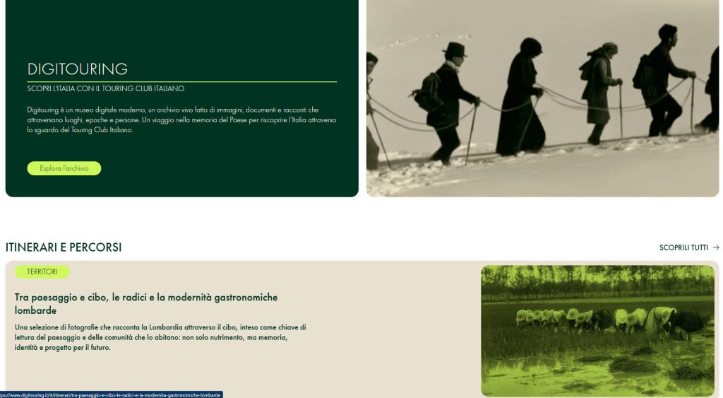 L’Archivio Storico del Touring Club Italiano custodisce centinaia di migliaia di fotografie, carte geografiche, guide, riviste, documenti e materiali editoriali che raccontano l’Italia dal tardo Ottocento a oggi: i suoi territori, le trasformazioni del paesaggio, i modi di viaggiare, lo sguardo dei viaggiatori e dei fotografi. Con Digitouring questo patrimonio, unico per ampiezza e valore storico, esce dai confini della conservazione per diventare esplorabile, connesso, messo in relazione.
