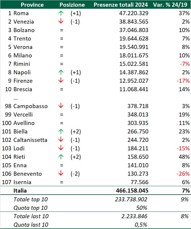 Nella classifica, rispetto al pre-pandemia, Roma supera Venezia, ora al primo posto, e Napoli scavalca Firenze. Nella top 10 tutte le province crescono, soprattutto Roma (+37%), Brescia (+14%), Bolzano e Milano (+10%) tranne Firenze (-17%) e Rimini (-7%).