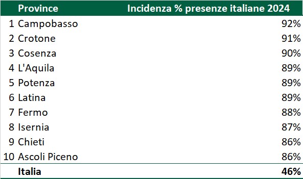Sempre nel 2024 si sono registrate 212 milioni di presenze domestiche, in calo del 2% rispetto al 2019, segnale della crisi dei consumi degli italiani. Le province frequentate quasi esclusivamente da connazionali (Tab. 3) sono quelle di Campobasso (92%), Crotone (91%) e Cosenza (90%). A parte il caso di Ascoli Piceno, Fermo e Latina, nella top 10 tricolore si trovano tutte province meridionali.