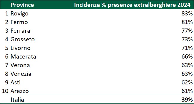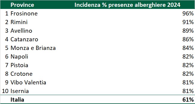 I dati nelle Tabb. 4 e 5 evidenziano forti differenze territoriali: nel Centro-Nord prevalgono le presenze in strutture extralberghiere (es. Rovigo, Fermo, Ferrara) mentre al Sud e in parte del Centro – con l’evidente eccezione di Rimini – domina invece l’offerta alberghiera (es. Frosinone, Rimini, Avellino). A livello nazionale, il comparto alberghiero resta prevalente (61%).